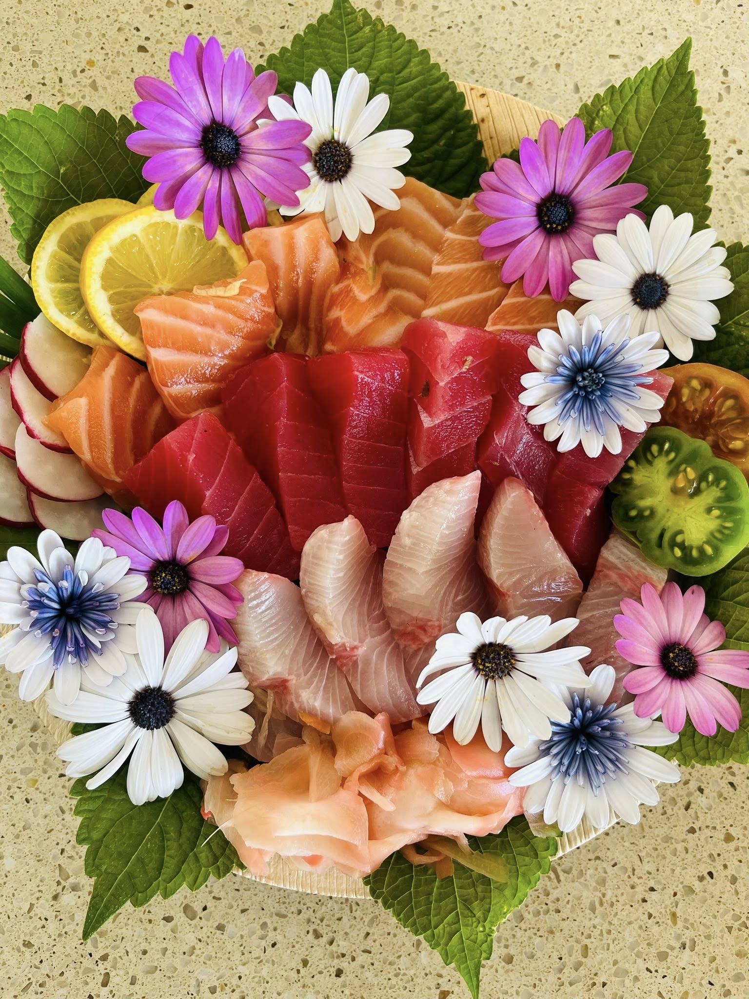 8 beautifully big & chunky fresh pieces each of tuna & salmon served with pickled ginger, soy sauce & wasabi on a bed of shaved lettuce and carrot with lemon and lemongrass & beautiful edible flowers.