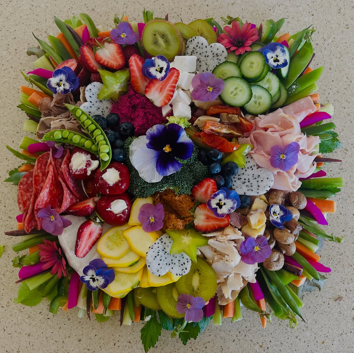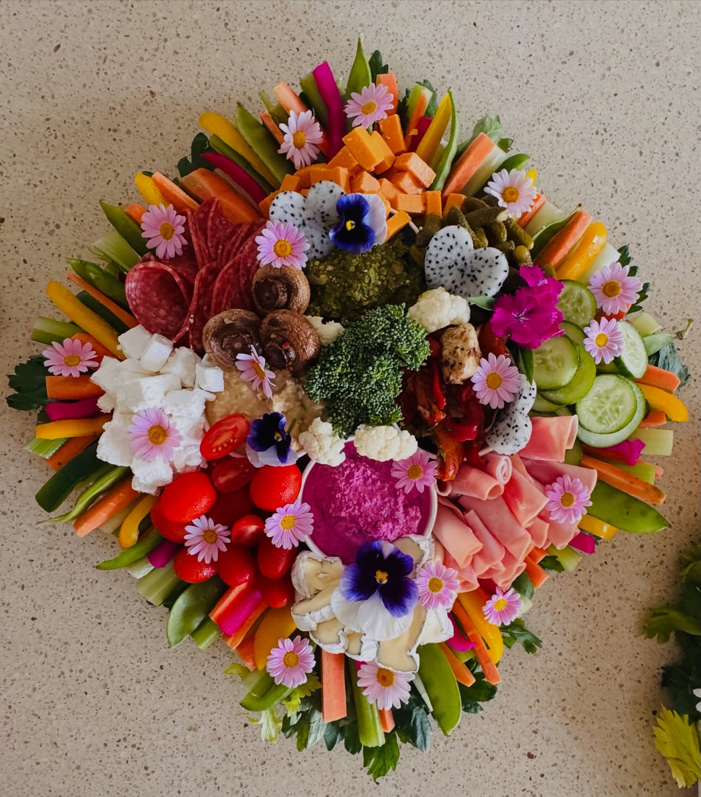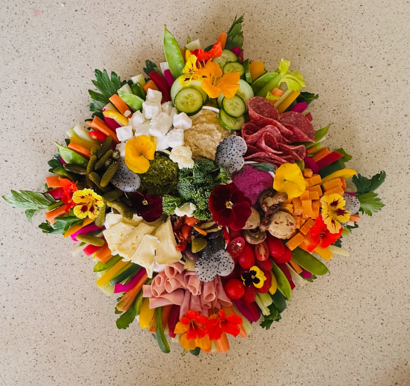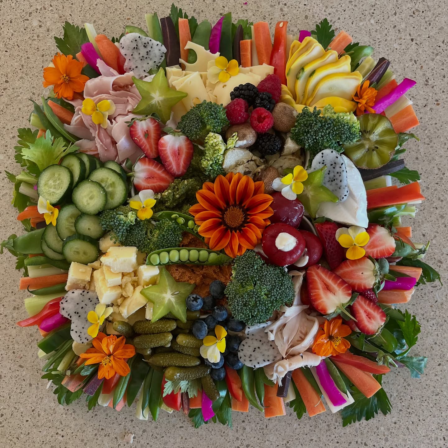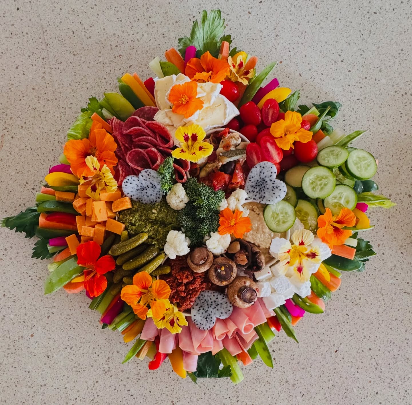 Packed with a mouthwatering selection of premium meats, artisan cheeses, creamy dips, marinated veggies, antipastos, crisp crudités, and fresh seasonal fruits — this stunning platter is a feast for both the eyes and the palate.