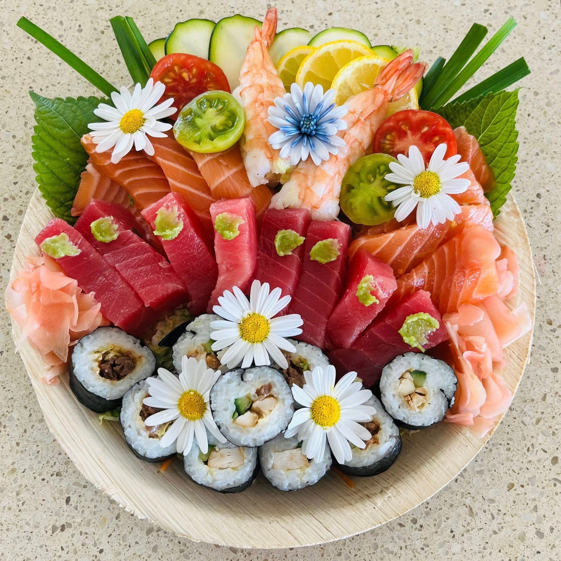4 beautifully big & fresh pieces each of tuna & salmon served with 8 mini nori roll pieces in your flavour choice, plus 4 nigiri pieces, pickled ginger, soy sauce & wasabi on a bed of shaved lettuce and carrot with lemon and lemongrass & beautiful edible flowers.